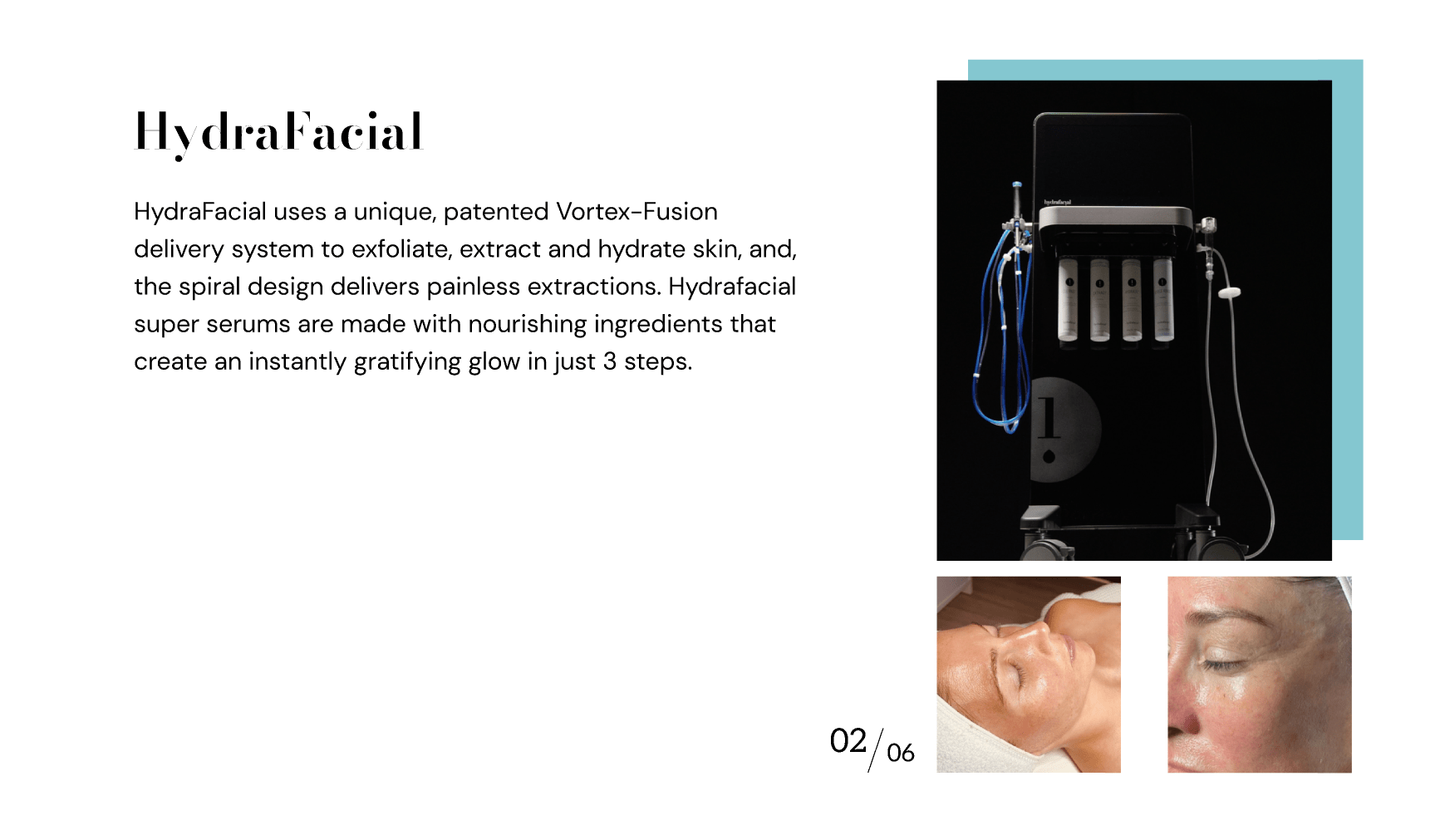 HydraFacial uses a unique, patented Vortex-Fusion delivery system to exfoliate, extract and hydrate skin, and, the spiral design delivers painless extractions.