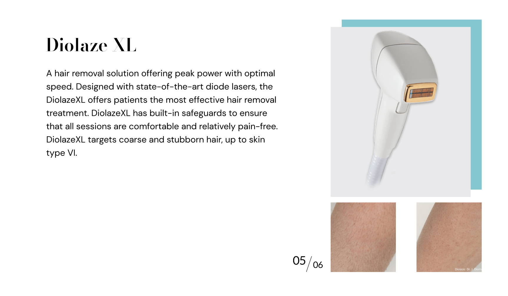 A hair removal solution offering peak power with optimal speed. Designed with state-of-the-art diode lasers, the DiolazeXL offers patients the most effective hair removal treatment. DiolazeXL has built-in safeguards to ensure that all sessions are comfortable and relatively pain-free. DiolazeXL targets coarse and stubborn hair, up to skin type VI.